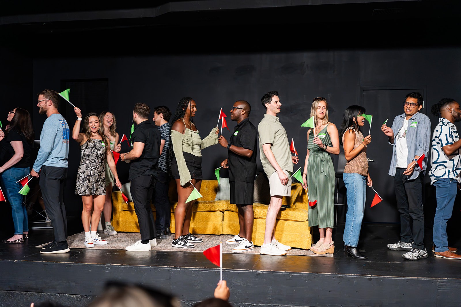 At the end of the show, we let you walk around the room & choose someone who you'd like to get on stage with for some rapid fire yes/no questions! We usually put up 10-15 couples.